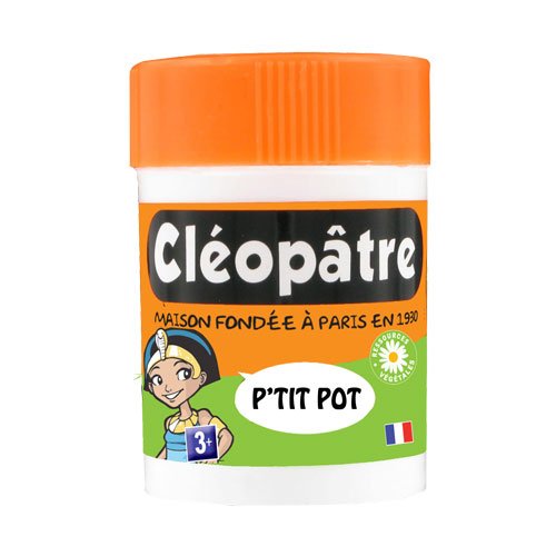 Tous les nostalgiques se souviennent du célèbre pot de colle Cléopâtre de fabrication française qui a marqué des générations entières surtout par son odeur particulière d'amande amère. Plus salissant que le tube de colle, il convient cependant d'avantage aux jeunes enfants (maternelle, CP), car plus facile à manipuler. C'est un collage efficace, il faut cependant faire attention à bien l'étaler pour ne pas faire de gros "pâté" de colle. Il est aussi largement utilisé pour les ateliers créatifs en art plastique.